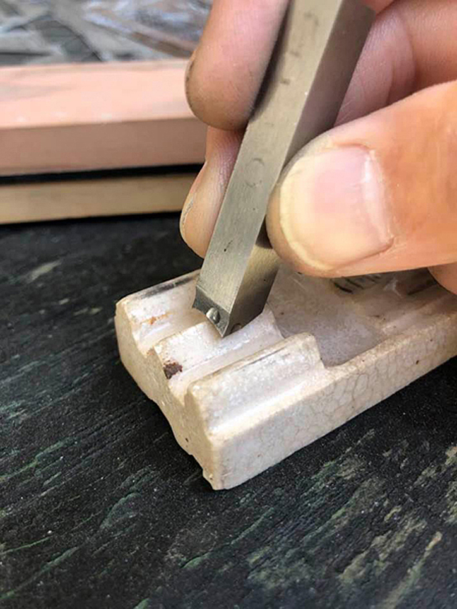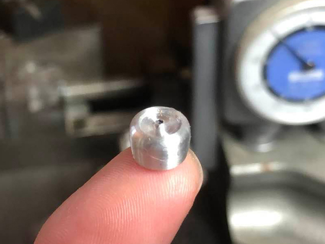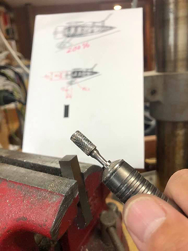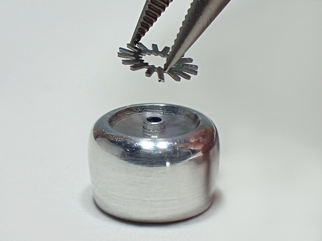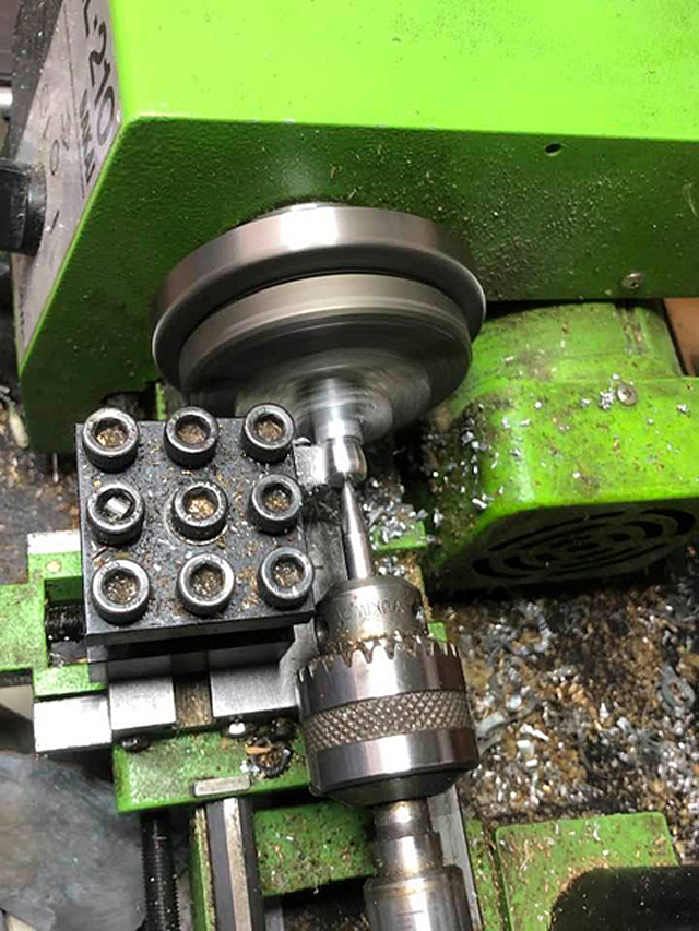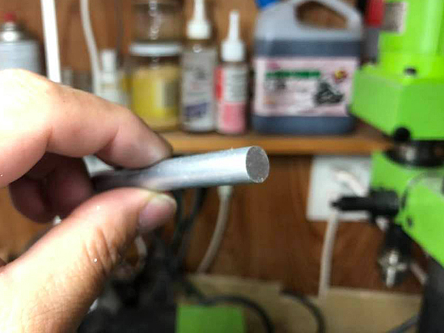 旋盤に取り付け、回転するアルミ棒に押し付けますと、こうなります。