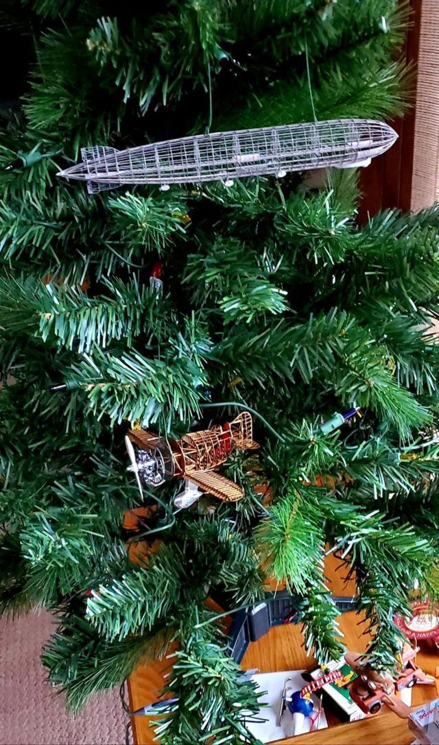 クリスマスツリーにエアロベースの模型を飾り付けています。