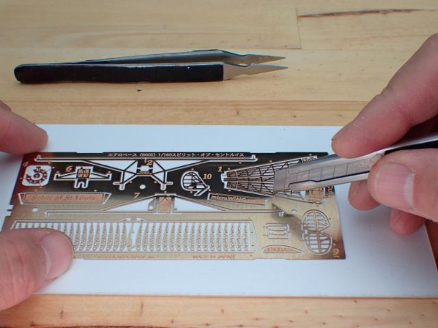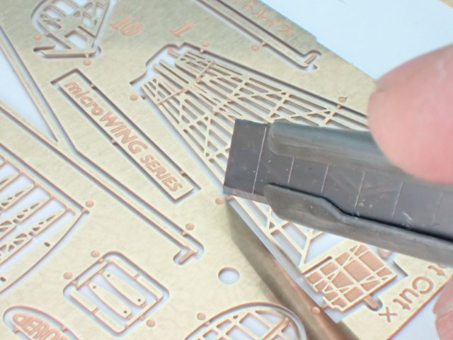 切り取りはカッターナイフを使います。刃の厚いニッパーやエッチング用ハサミは使用できません。パッケージに入っている厚紙をカッティングマットとして使えます。
