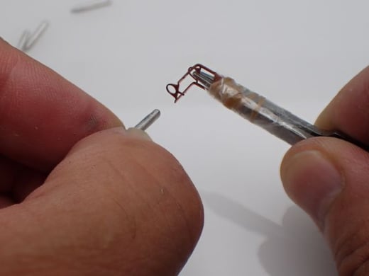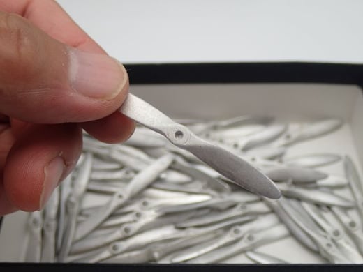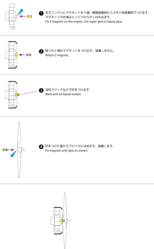 1/48赤とんぼのプロペラはマグネットでエンジンに取り付けます。マグネットはお客様にはめ込んでいただきますが、穴開けは当社で済ませています。プロペラもエンジンも、それぞれ2個ずつマグネットがはまります。マグネットの厚みは1mmx2個=2mmになりますが、プロペラが回転するように2mmより少し浅い穴に仕上げます。