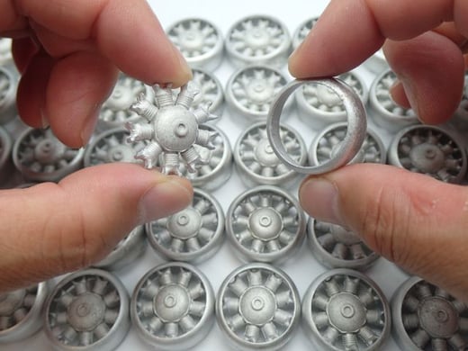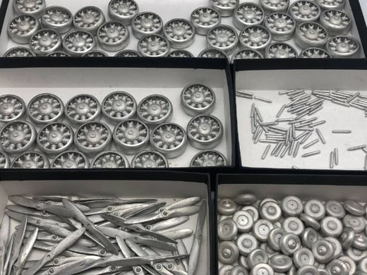 原型を押し当てて作ったゴム型の中心からホワイトメタルを流し込みますが、このときゴム型を回転させて遠心力で型の中にくまなくホワイトメタルを行き渡らせます。原型とそっくりなパーツを大量生産できるというわけですが、ホワイトメタルの収縮、遠心力によるゆがみが発生します。なので、量産品はぜんぶ同じに見えて、少しずつゆがみや大きさが違います。さらに、正確な穴開けは生産後に別途やったほうがきれいにできますし、バリ(型の合わせからはみ出た分)や湯口(流し込む枝部分)を取り除く必要があります。基本的にバリ等はお客様がヤスリがけするのが、「キットの相場」となっていますが、ドリル穴はメーカーが開けておいたほうが親切ですね。