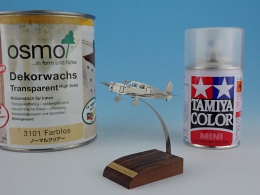 他社のプラモデルを飾ったところ。台をヤスリで削って丸みをつけています。自由にアレンジできるのが木製の良い点ですね。