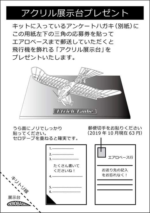 キットに入っているアンケートハガキに「展示台プレゼントシール」を貼って当社まで郵送された方にアクリル製展示台をお送りしています。