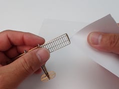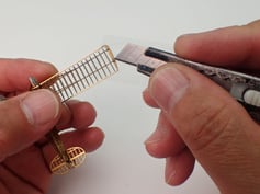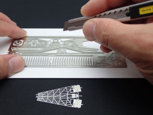 金属模型なのに、小型のカッターナイフでプチっと押し切れます。カッターマットか、キット付属の台紙(厚紙)の上で切りましょう。尖った刃や、薄いデザインナイフは金属を切るのに適していません。