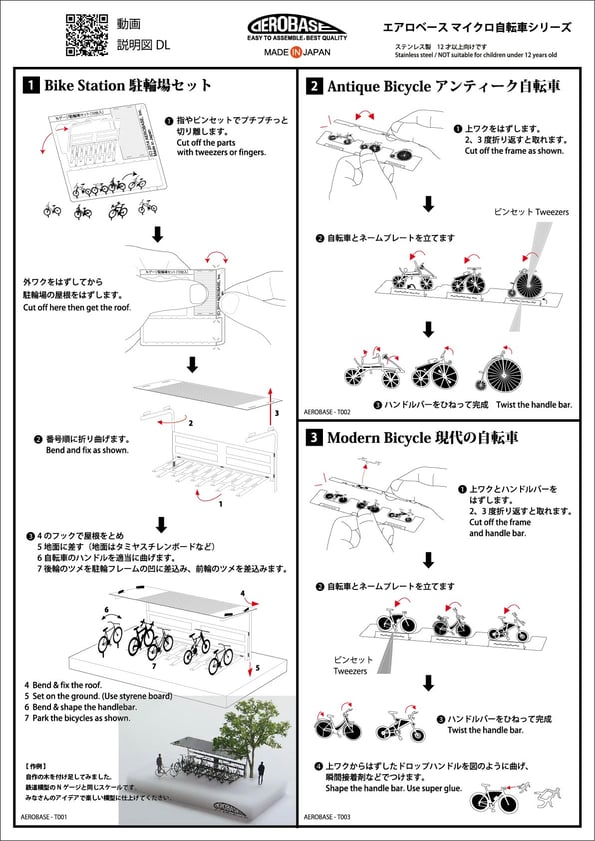駐輪場と自転車10台セット。人物2体付き。駐輪場は骨組と屋根のたった2個のパーツの組み合わせ。接着剤は使いません。実物の1/150スケールで鉄道模型のNゲージサイズですから、レイアウト(ジオラマ)に使用できます。駅前や施設に駐輪場を置いてみましょう。全長1.2cmほどの自転車は5種入り。実物の駐輪場を計測して設計しました。小径自転車ガープは私の友人、宿野輪天堂の岡田氏より図面提供を受けました。「そっくりです」って。