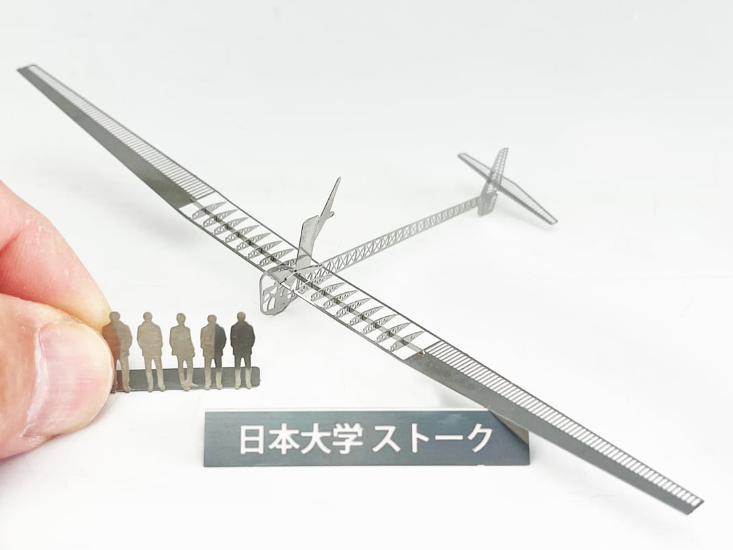 エアロベースの人力飛行機シリーズ第8弾。実機設計者の石井潤治氏より図面の提供を受け、模型化しました。リサーチすればするほど、当時の人力飛行機をはるかに凌駕した美しいフォルムに惹かれていきました。設計に際してはシンプルな構成をこころがけ、たった3つのパーツで完成することができました。日本大学さまからは校名の使用許諾をいただき、ネームプレートに刻みました。日本大学理工学部機械工学科航空宇宙工学コースの学生フィギュアが付属します。