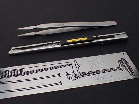 おすすめのタミヤ製デカールピンセット。幅広でパーツをつかみやすく、先端が薄いので隙間に入りやすいです。