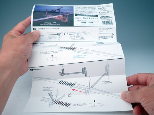 1977年1月2日、日本大学ストークは2093.9mという人力飛行機による世界最長飛行記録を達成しました。日本大学の木村秀政先生の元、学生たちが設計製作した人力飛行機は、1966年のリネット(飛行距離91m)、72年のイーグレット(同203m)から、75年のストークに発展。ストークは石井潤治氏がチームリーダーとなり、さらに改良を重ね、ついに大記録を打ち立てたのでした。バルサという軽い木で繊細に組み立てられた機体に、ガンピ紙を貼って完成しました。