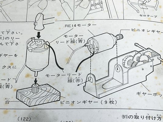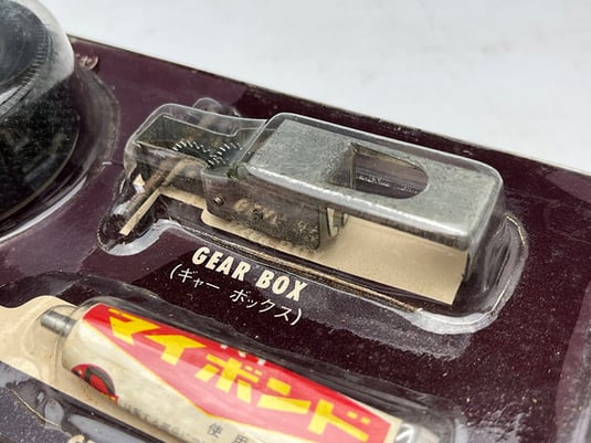 ギャー ボックス(ママ)。これが貴重です。再販されてもだいたいこの部品がなくて、モーター走行できないことが多いですね。プレス型が残っていないとか、プレス工場や職人がいなくなっているという都合もあるのでしょう。