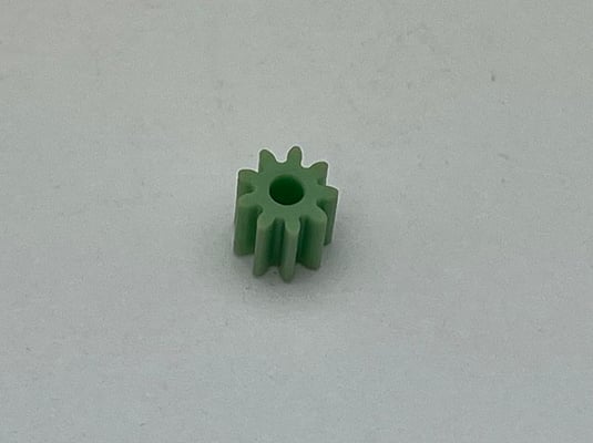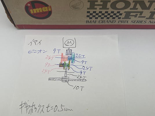 私にとっては、この9枚ピニオンギヤーが珍しいです。模型用としては、8枚、10枚、12枚のどれかですよね。これを打ち込むと、経年(すでに50年ほど経っていますが)で、必ず割れます。そして空回りして走らなくなるというパターン。
