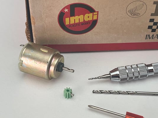 モーター軸にピニオンギヤーを打ち込むところから始まります。