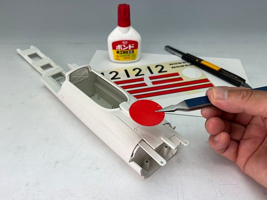 マークが硬くて、カウルのフチのような細かい曲面には貼れません。マークの端は切り捨てて、タミヤのエナメル塗料でタッチアップします。