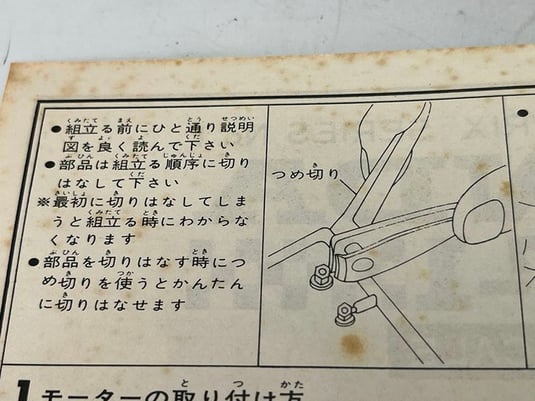 プラパーツはつめ切りでカットするよう指示があります。どんな田舎でも模型屋があった時代ですが、逆に学校前の文具店やスーパーマーケット等どこでも買えた分、工具や塗料まで揃えていない店もたくさんあったはず。家庭にあるもので代用しましょうということですね。