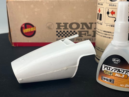 フロントカウルは、木工用の瞬間接着剤(ドロドロの)でくっつけます。後ろにあるのは、瞬間接着剤をより早く乾かすための促進スプレーです。