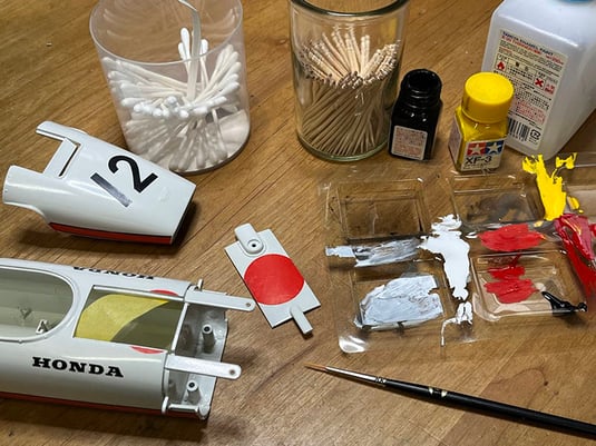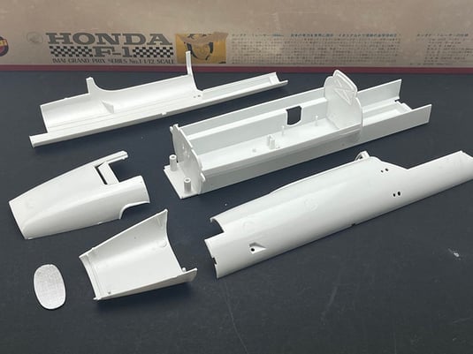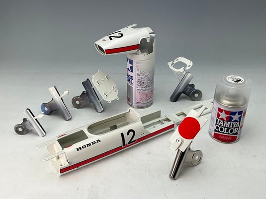 全体にタミヤのクリヤーをスプレーしました。しっかり乾かすあいだに、タミヤのホンダF-1に取り掛かります。