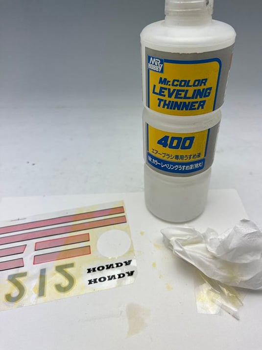 マークは、水で溶くタイプではなく。いわゆるステッカーです。黄ばんでいるのはフィルムではなく、裏面のノリの劣化ですね。