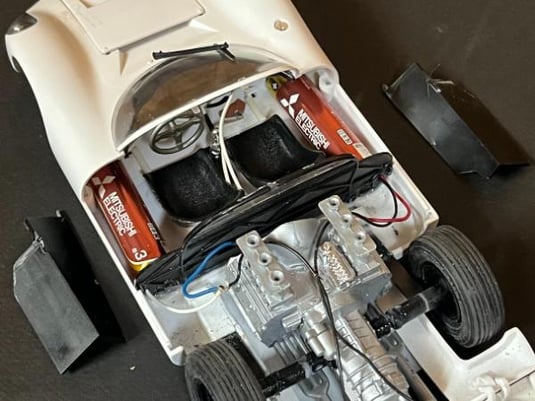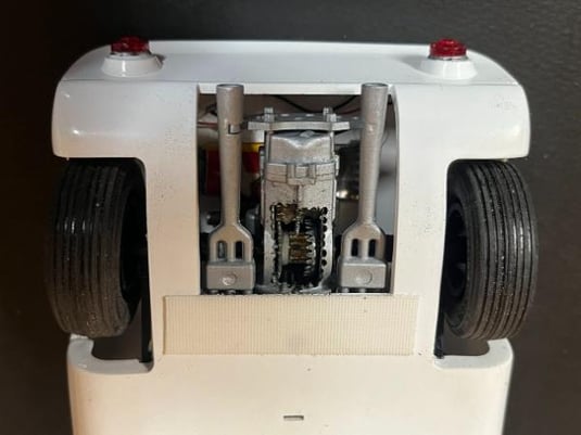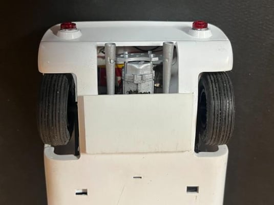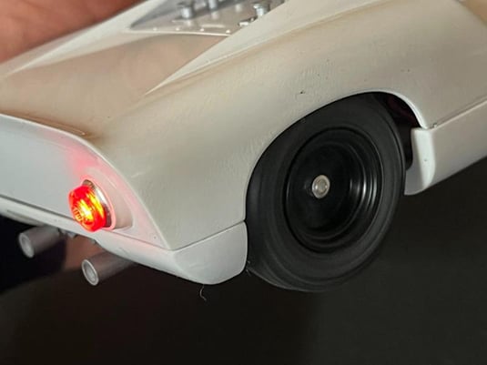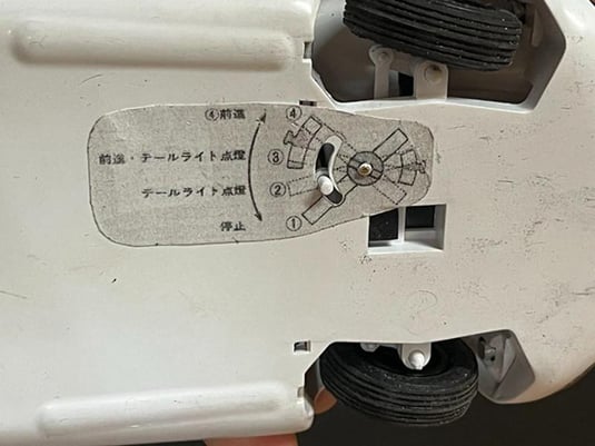 テールライトが点灯し、タイヤも回ります。スイッチを少し戻すとモーターが止まりテールライト点灯のみ、逆にスイッチを進めるとテールライトは消え、モーターのみ動きます。かと言って、目に見えて速くなった感じはありません。
