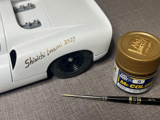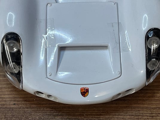 なのでポルシェのエンブレムの上にセロテープを貼ってマークの外線にそって切り抜いておきます。それをぬるま湯につけ、セロテープごとボディに貼りました。ノリは効きませんので、木工ボンドをつけて貼りました。