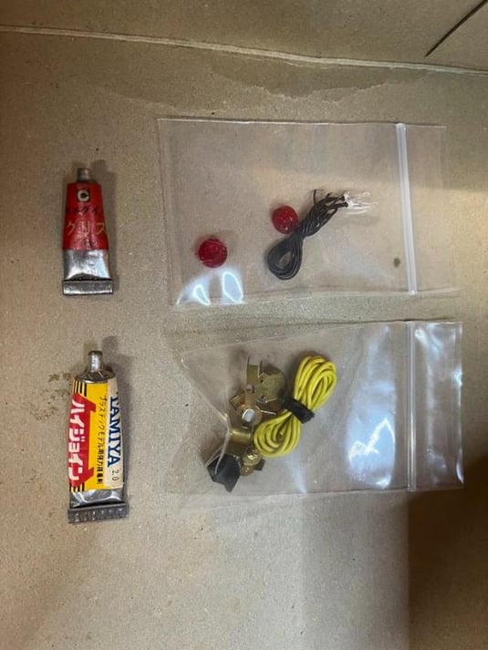 グリス、接着剤、ムギ球、テールライト(赤の透明プラ)、コード、電池金具。いかにも当時のプラモ。