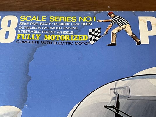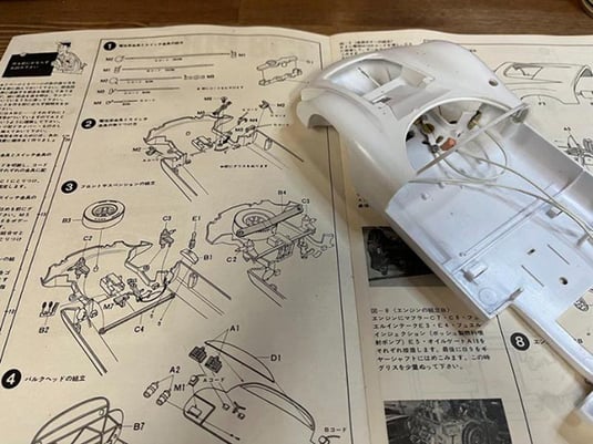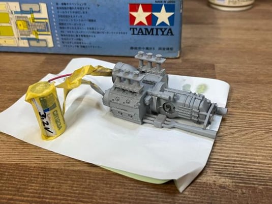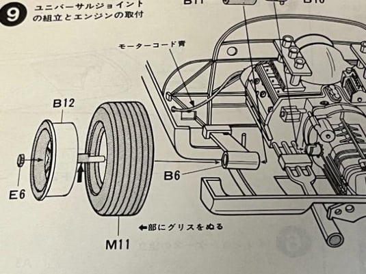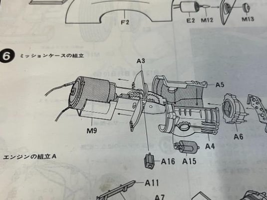モーターが組み込まれた状態のギヤーボックス。もうこれだけで「友達と競争させたい!」と思わせる演出がなされています。現代のプラモデルはパーツ点数の多い複雑なディスプレイモデルが主流ですが、当時は走らせて遊ぶのが当たり前だったんですね。うまく走るように作れるかな?