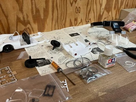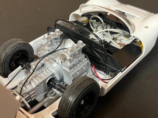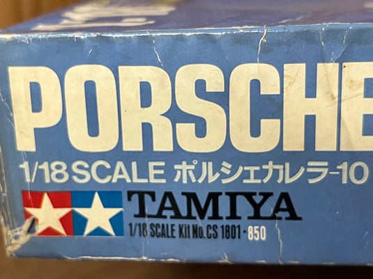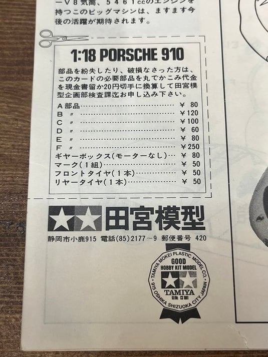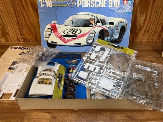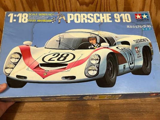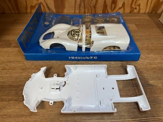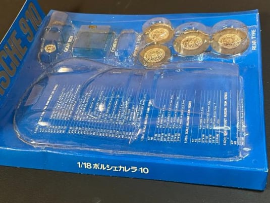 なぜ憧れかというと、子供が買える値段のプラモには「かたまりのタイヤ」しか入っていなかったのでした。小中学生のころ、タミヤ1/12F1は高嶺(値)の花で、私にとってはこの1/18シリーズが中空タイヤに触れる最初でした(このポルシェではなく、ローラ)