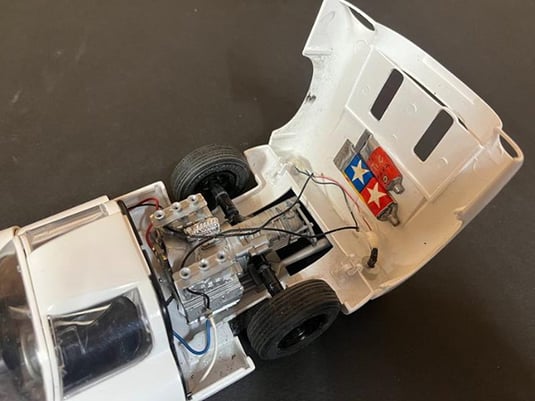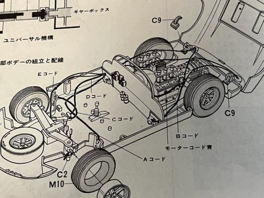 前輪の切れ角はかなり大きいです。スイッチ図のコピーを貼りました。おふざけとも取れる工作ですが、当時の子供もこんなふうに自由に遊んだのかなと想像しながら貼りました。