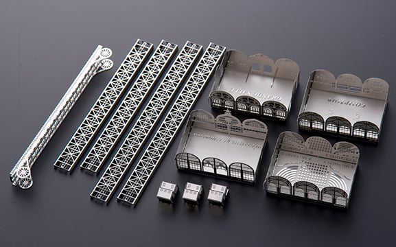 1889年のパリ万博の目玉として建設されたエッフェル塔は、それまでの石造り中心の建築物とはまったく違っていました。ギュスターブ・エッフェル率いるチームは、鉄骨の組み合わせで300メートルもの高さの塔をわずか二年で建てることに成功しました。塔を支える4本の脚の内部には、地上階から1階へ斜めに上がるエレベーターが採用されました。そのおかげで、脚をつなぐアーチの下は何もない広大な空間がつくられ、エッフェル塔の美しさを際立たせています。エアロベースでは、二度の現地取材を経て、ステンレスの組み合わせによる接着剤不要のパズル的オブジェに仕立てました。