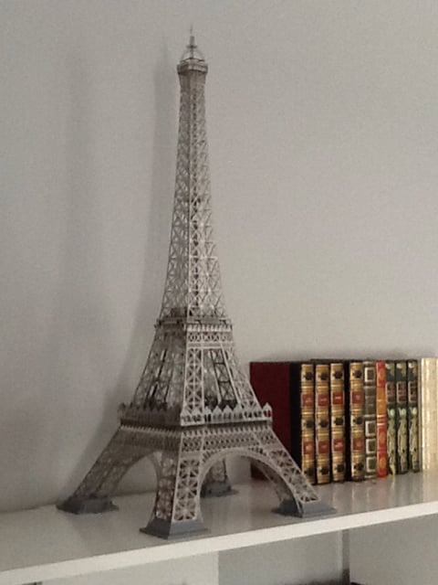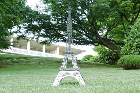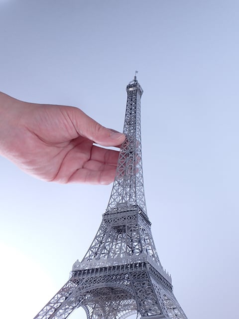 究極の骨組みモデル、エッフェル塔の模型を設計するためにパリに飛びました。間近で見るエッフェル塔の迫力は本物でした。ヨーロッパの石造りとも、紙と木でできた日本の建物ともまったく違います。鉄骨構造を大型建築に初めて採用したのが、ギュスターブ・エッフェル氏でした。エッフェル塔は、1889年のパリ万博のシンボルとして建てられました。パリ万博の後には解体される予定だった塔は、エッフェル氏らの苦心によって保存されてきました。みなさまのパリ旅行の思い出に、この模型をお手元に置かれることを願います。