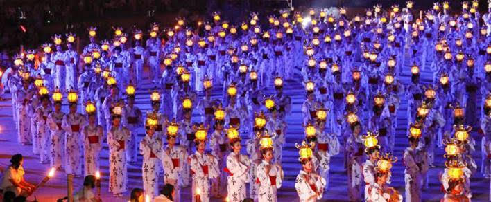 金灯籠(かなとうろう)を頭にのせた女性1,000人による踊りが優美です。