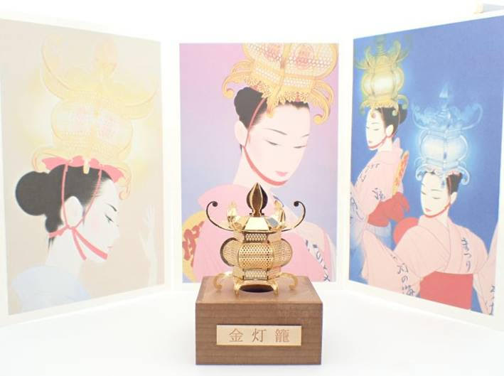 背景のポストカードは、ノエビアのCM画でおなじみの日本画家・鶴田一郎先生が描く山鹿灯籠まつりの様子です。
