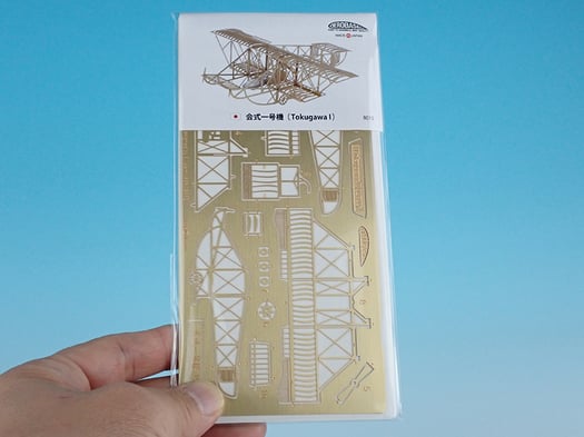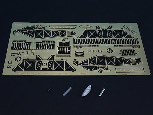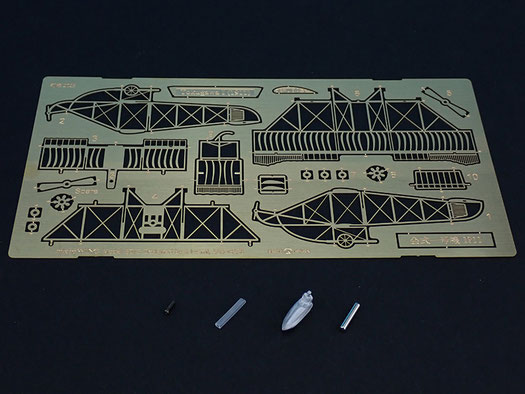 真鍮エッチングパーツのほか、下段左から黒ネジ、ゴムチューブ、コクピット、そして、マグネット棒。