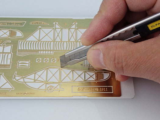 真鍮エッチングパーツはごく普通のカッターナイフで切り取れます。