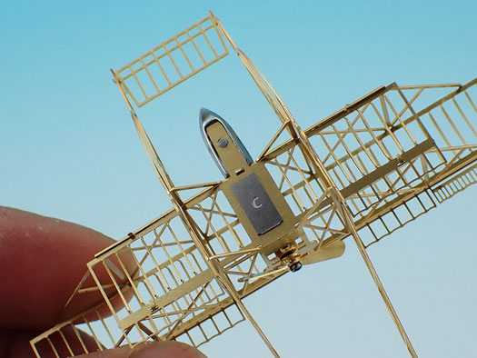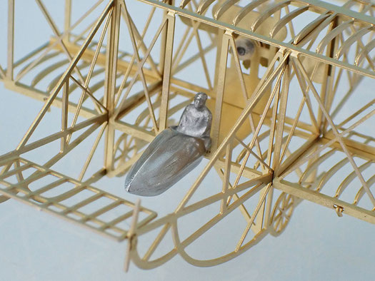 機体が地上にあるとき、エルロンはこのように下がっています。アンリ・ファルマン同様、滑走時の空気圧を利用して上げていくようです。